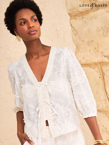 Love & Roses Ivory 3D Floral Print Short Sleeve Tie Front Blouse