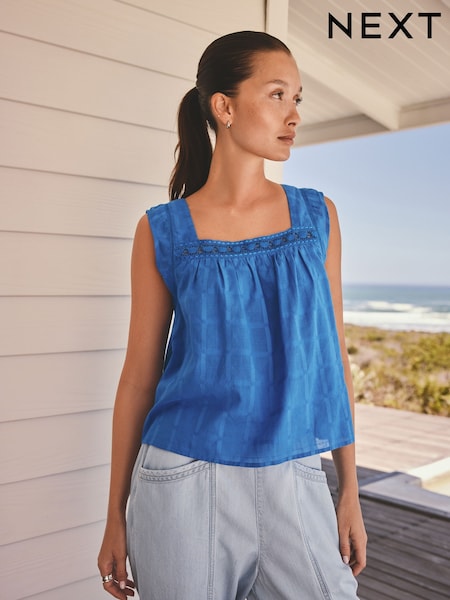 Blue Square Neck Lace Detail Cami Top