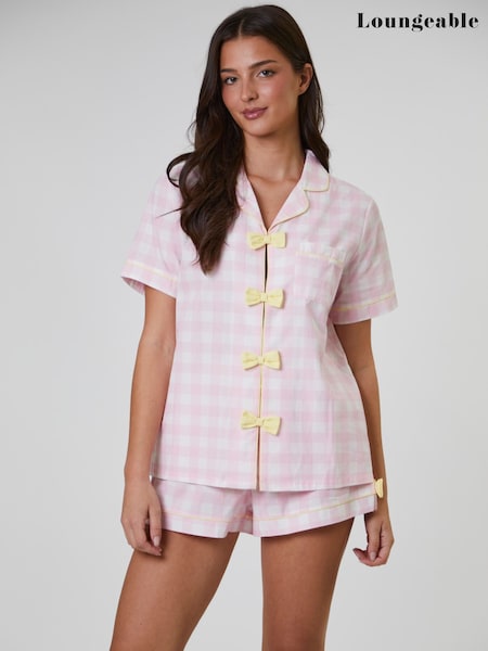 Loungeable Pink Checked Bow Detail Short Sleeve and Short Set Pyjamas