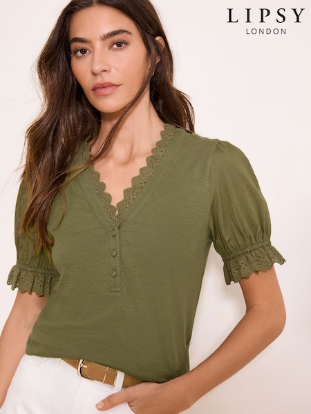 Lipsy Khaki Green V-Neck Trim Detail Button Through Jersey Top