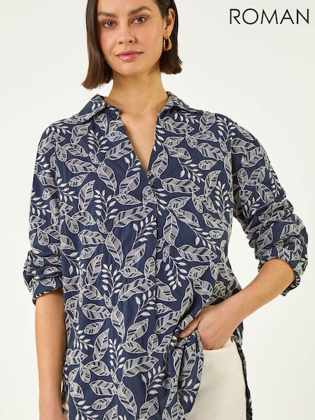 Roman Blue Leaf Embroidered Collared Top