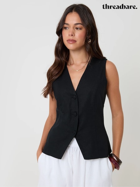 Threadbare Black Linen Blend V-Neck Waistcoat