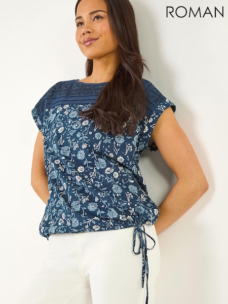 Roman Blue Petite Floral Embroidered Top