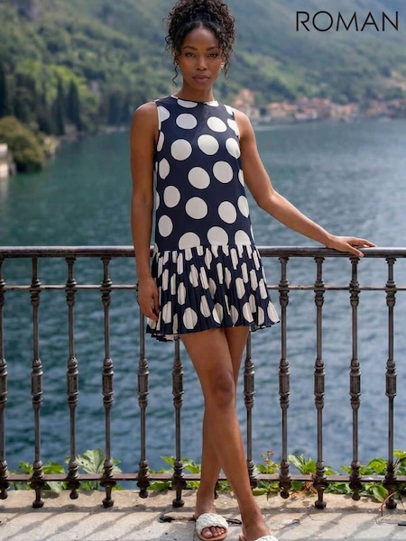 Roman Blue Spot Print Pleated A-Line Dress
