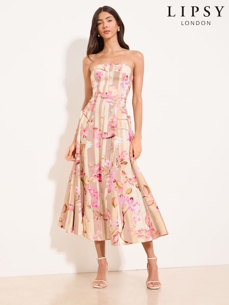 Lipsy White Stripe Floral Printed Bandeau Linen Look Midi Skater Dress