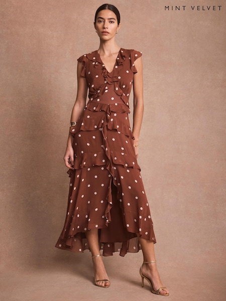 Mint Velvet Brown Polka Dot Ruffle Midi Dress
