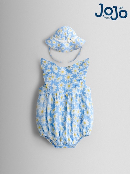 JoJo Maman Bébé Blue Daisy Seersucker Frill Romper & Hat Set