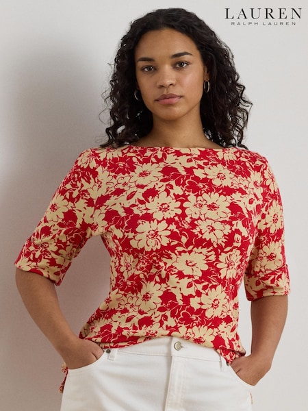 Lauren Ralph Lauren Red Floral Stretch Cotton Boatneck T-Shirt