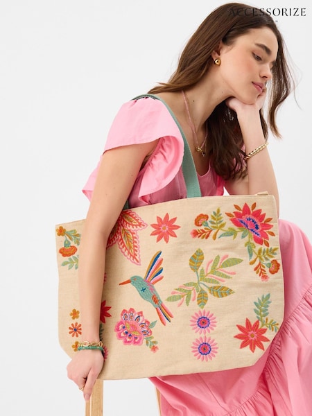 Accessorize Natural Embroidered Beach Tote Bag