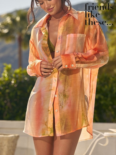 Friends Like These Orange Scenic Print Button Up Beach Cover-Up Shirt