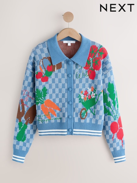 Blue Gingham Long Sleeve Knitted Embroidered Collar Cardigan