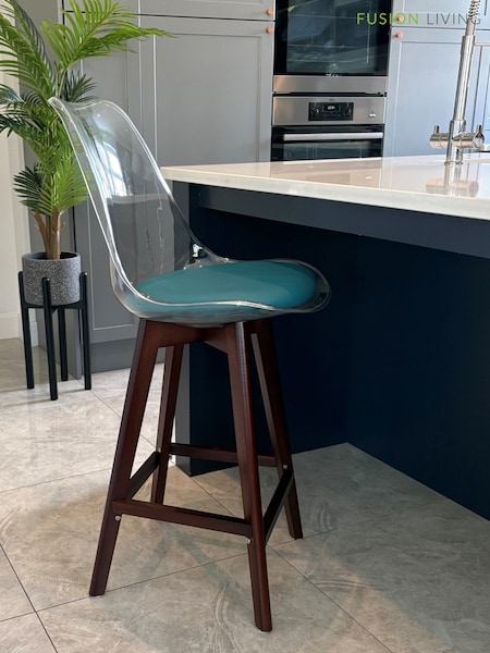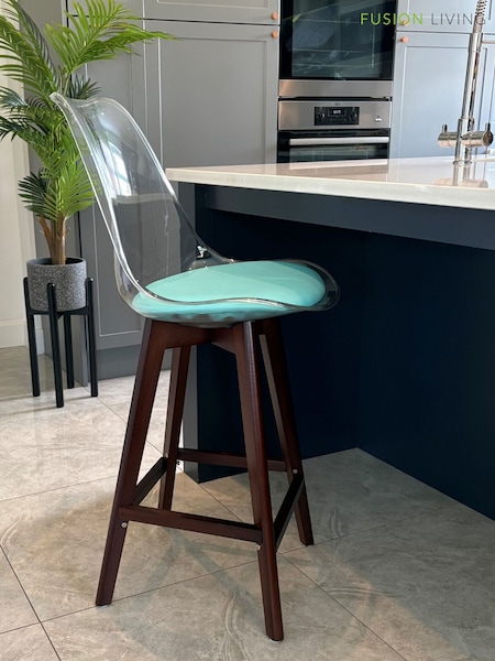 Fusion Living Teal Soho Clear Plastic Bar Stool with Dark Wood Legs