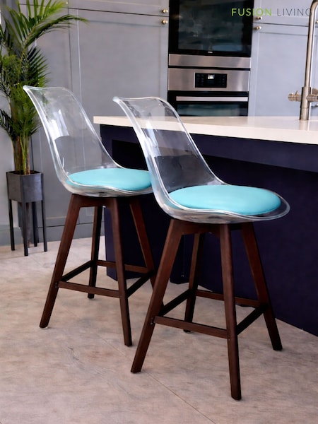 Fusion Living Set of 2 Aqua Soho Clear Plastic Bar Stools with Dark Wood Legs