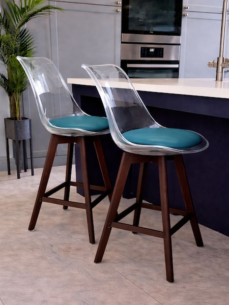 Fusion Living Set of 2 Teal Soho Clear Plastic Bar Stools with Dark Wood Legs