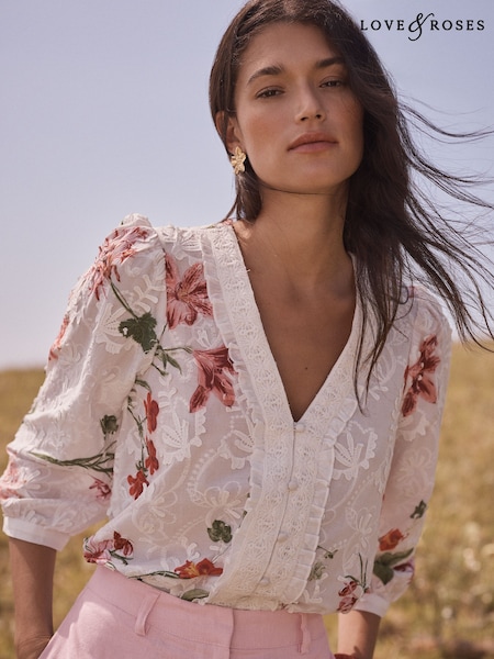 Love & Roses x RHS Ivory 3D Floral Print Blouse