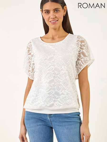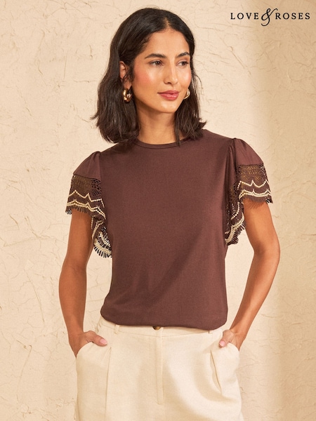 Love & Roses Chocolate Brown Crochet Fluuter Sleeve Jersey T-Shirt