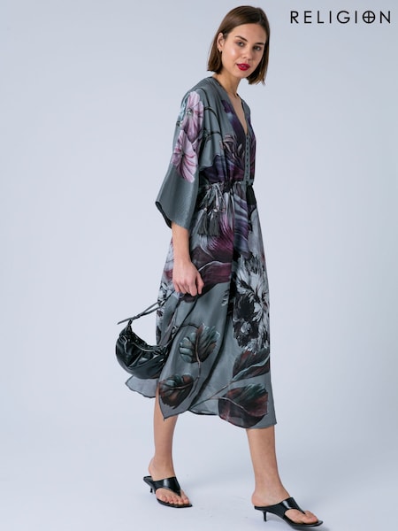 Religion Grey Denise Floral Occasion Tunic Dress With Tassle Tie Detail