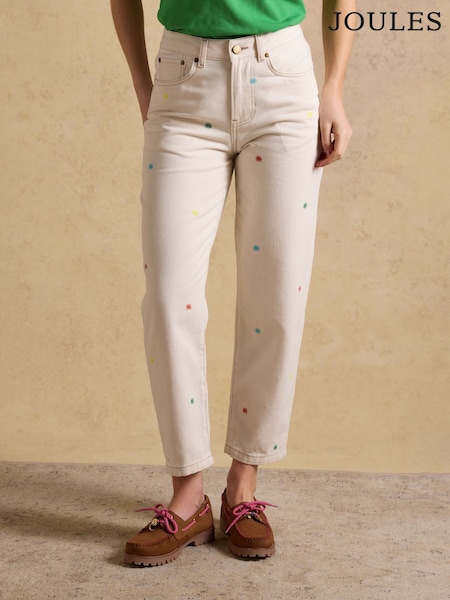 Joules Cream Embroidered High-Waisted Tapered Fit Jeans