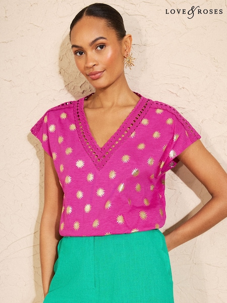 Love & Roses Pink Foil Print Lace Insert V-Neck Jersey T-Shirt