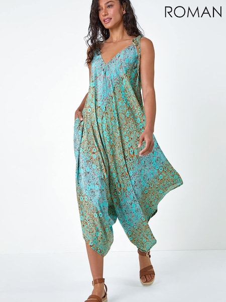 Roman Blue Paisley Floral Pocket Slouchy Jumpsuit