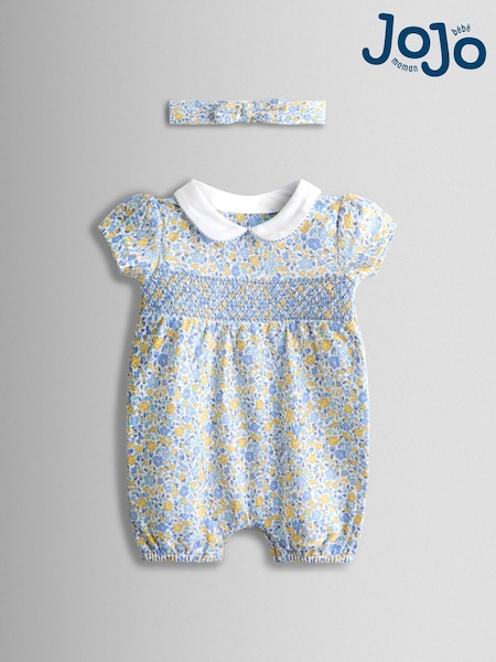 JoJo Maman Bébé Light Blue Floral Collared Smocked Romper