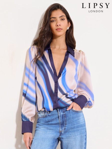 Lipsy Blue Swirl Stripe Print Military Button Detail Satin Shirt