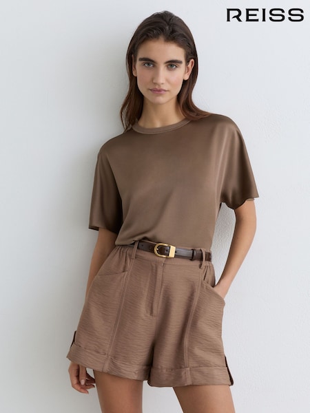 Reiss Taupe Brown Lena Silk Short-Sleeve Top