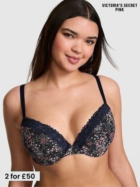 Victoria's Secret PINK Noir Navy Blue Floral Print Super Push Up Cotton Heather Lace Trim Bra