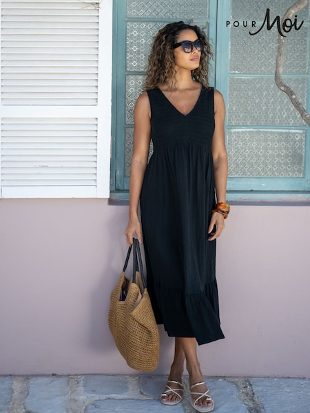 Pour Moi Black Crochet Bodice Cotton Slub Midi Dress