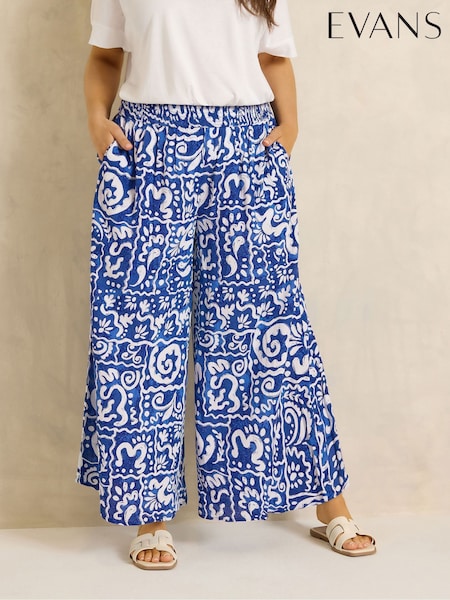 Evans Blue Printed Shirred Waist Trousers