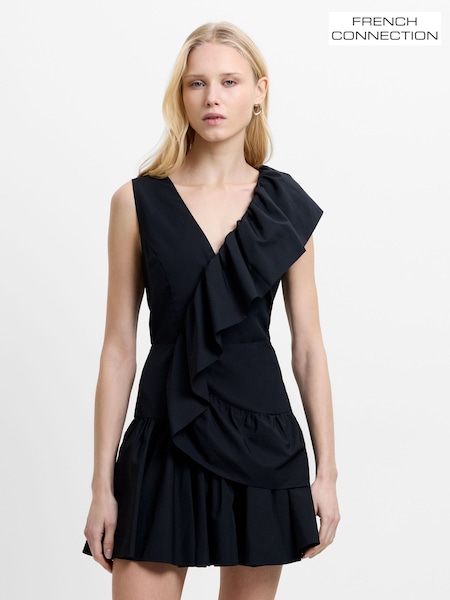 French Connection Black Era Poplin Asymmetric Frill Mini Dress