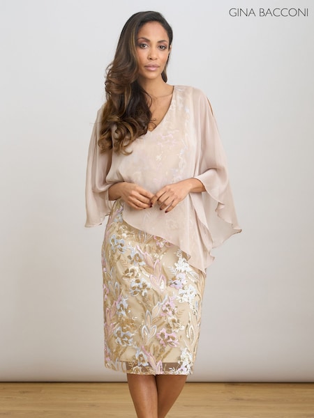 Gina Bacconi Natural Monroe Short Embroidered Dress With Chiffon Bodice