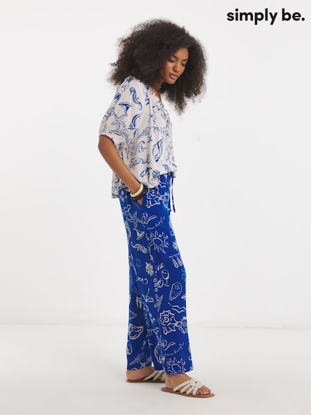 Simply Be Blue Shell Print Wide Leg Crinkle Trousers