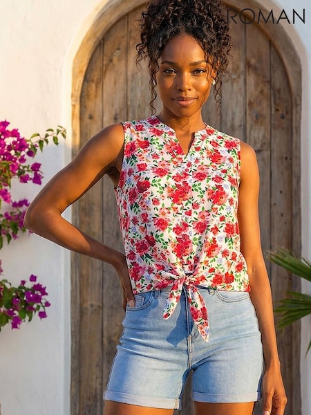 Roman Red Floral Tie Front Blouse