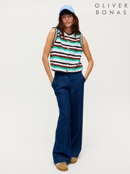 Oliver Bonas Blue Multicoloured Striped Button Up Knitted Waistcoat