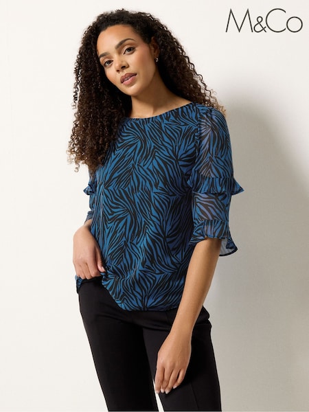M&Co Blue Swirl Print Frill Sleeve Blouse