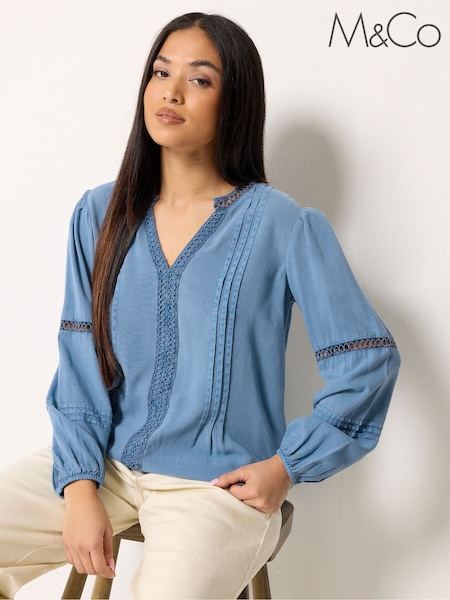 M&Co Blue Pintuck Trim Long Sleeve Blouse