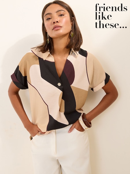 Friends Like These Beige Geo Print Short Sleeve Button Detail Blouse With Collar