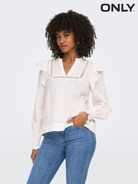 ONLY White Frill Detail Long Sleeve Cotton Blouse
