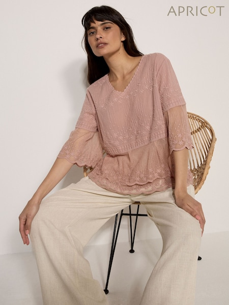 Apricot Pink Embroidered Cotton Mesh Blouse
