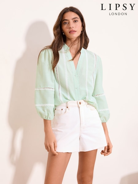 Lipsy Green Stripe Poplin 3/4 Sleeve Grandad Blouse