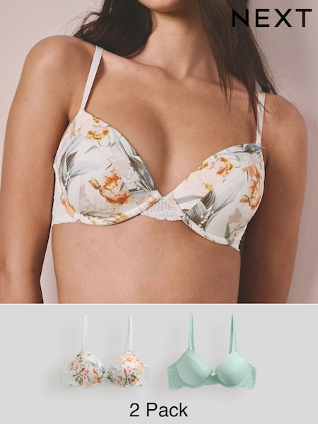 Green/Cream Floral Push Up Pad Plunge A-E Smoothing T-Shirt Bras 2 Pack