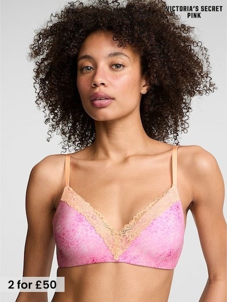 Victoria's Secret Pink Coconut Pink Leopard Non Wired Lightly Lined Cotton Heather Lace Trim Bra