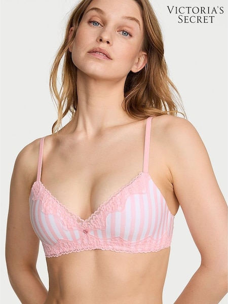 Victoria's Secret Pretty Blossom Pink Stripes Lightly Lined Non Wired Cotton Lace Trim Bra