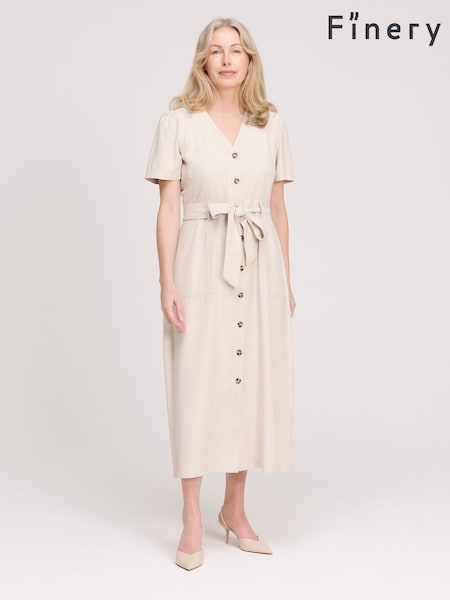 M&Co Natural Petite V-Neck Fit & Flare Linen Blend Dress