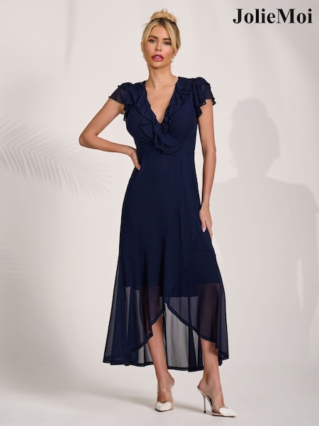 Jolie Moi Blue Ruffled Mesh Maxi Dress