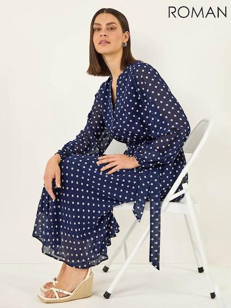 Roman Blue Spot Print Pleated Midi Dress