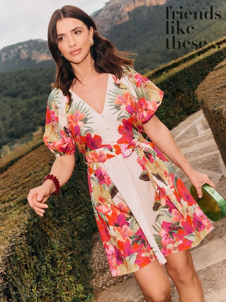 Friends Like These X Lucy Mecklenburgh Ivory/Pink Floral Belted Puff Sleeve Mini Dress
