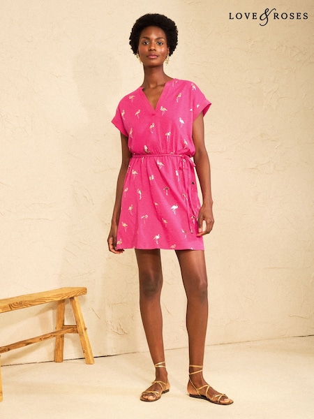 Love & Roses Pink Flamingo Foil Print Notch Neck Mini T-Shirt Dress