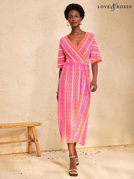 Love & Roses Pink And Orange Wrap Front Striped Gold Detail Knitted Midi Dress